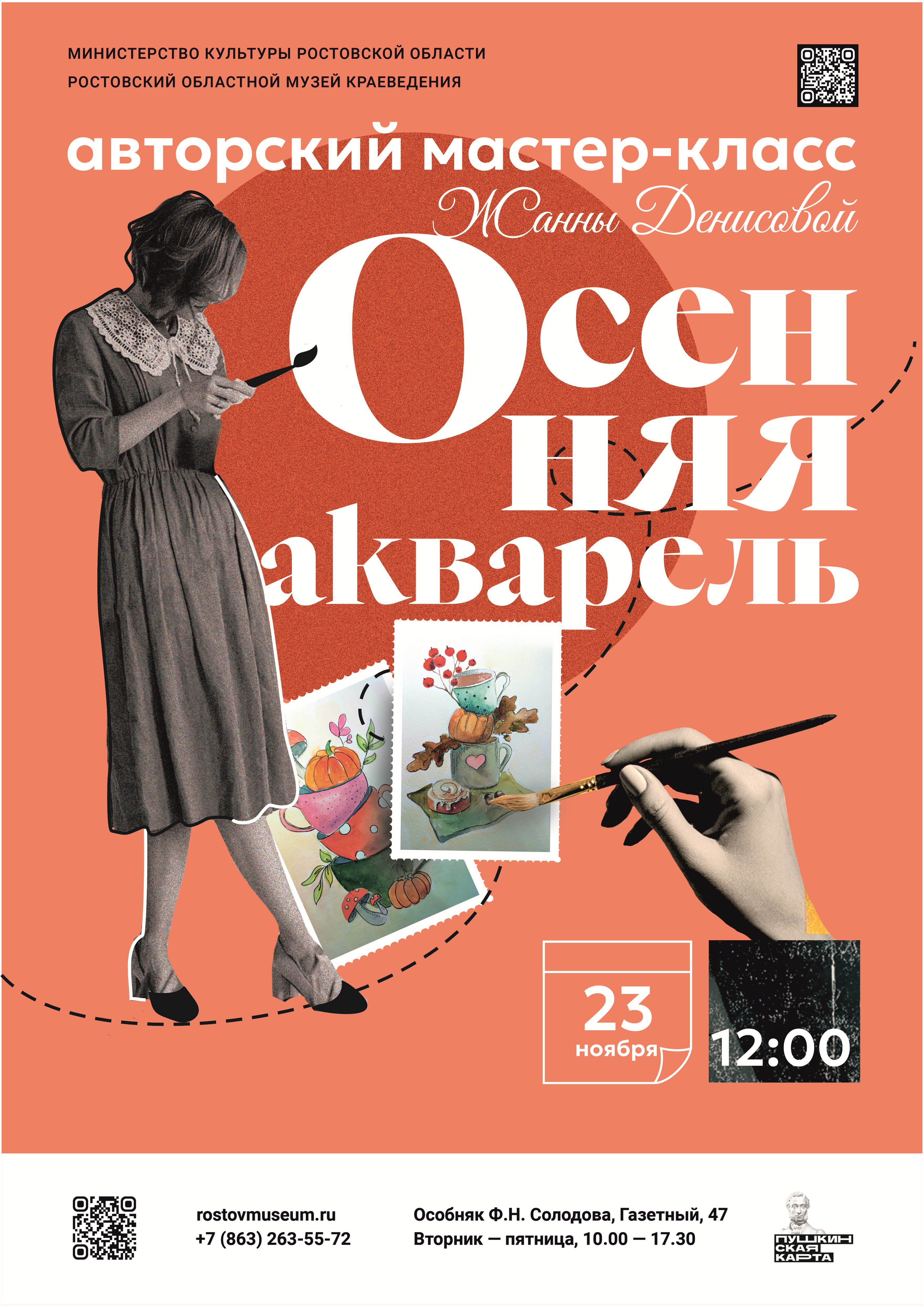 Ростовский областной музей краеведения приглашает посетить авторский мастер-класс «Осенняя акварель», который состоится 23 ноября в 12.00 в особняке Ф.Н. Солодова (пер. Газетный, 47).
